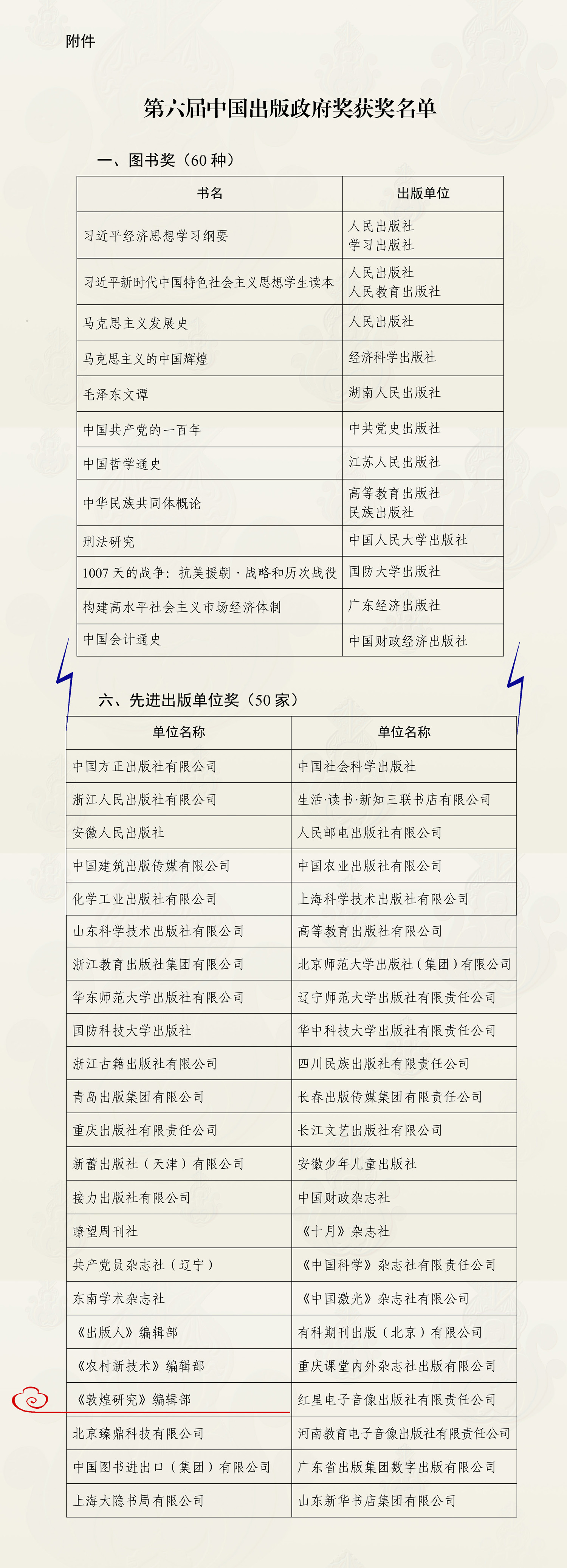 为总结经验、树立典型,进一步激励出版战线守正创新、开拓进取,国家新闻出版署组织开展第六届中国出版政府奖评选表彰活动。经逐级申报和评审,《习近平经济思想学习纲要》等60种图书获图书奖,《党的文献》等20种期刊获期刊奖,《领航》等20种作品获音像制品、电子出版物和网络出版物奖,《中国共产党历史 第二卷(1949—1978)》(上、下册)等10种作品获印刷复制奖,《燕京传薪录——中法汉学研究所未刊稿研究》等10种作品获装帧设计奖;中国方正出版社有限公司等50家单位获先进出版单位奖;陈小文等70名个人获优秀出版人物奖,特予以表彰。